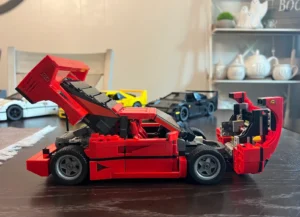 Ferrari F40 model with ~1,100+ pieces, opening panels, and engine detailing.